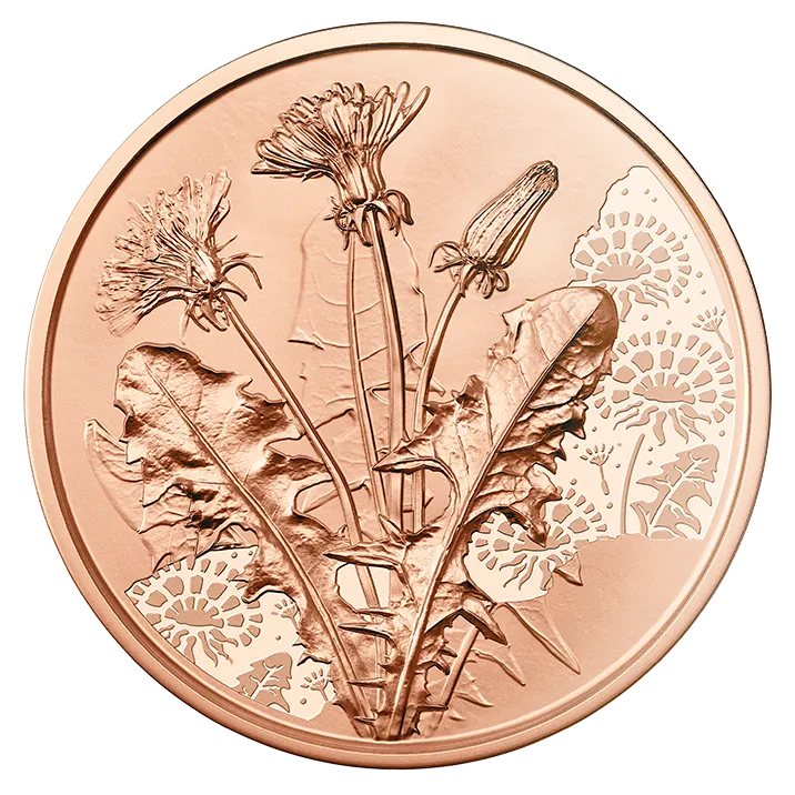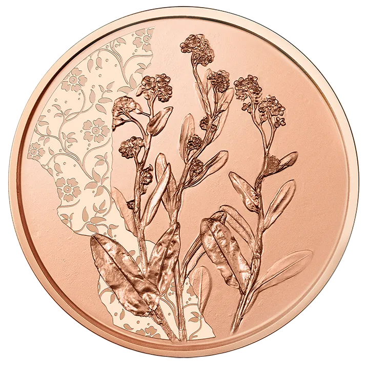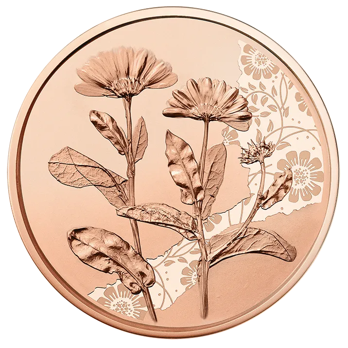 The coins feature imprints of roses, dandelions, marigolds, forget-me-nots, chamomiles, peonies and violets that were all produced from living flowers, so bear a perfect resemblance to the flowers they celebrate and keep them alive for ever.
