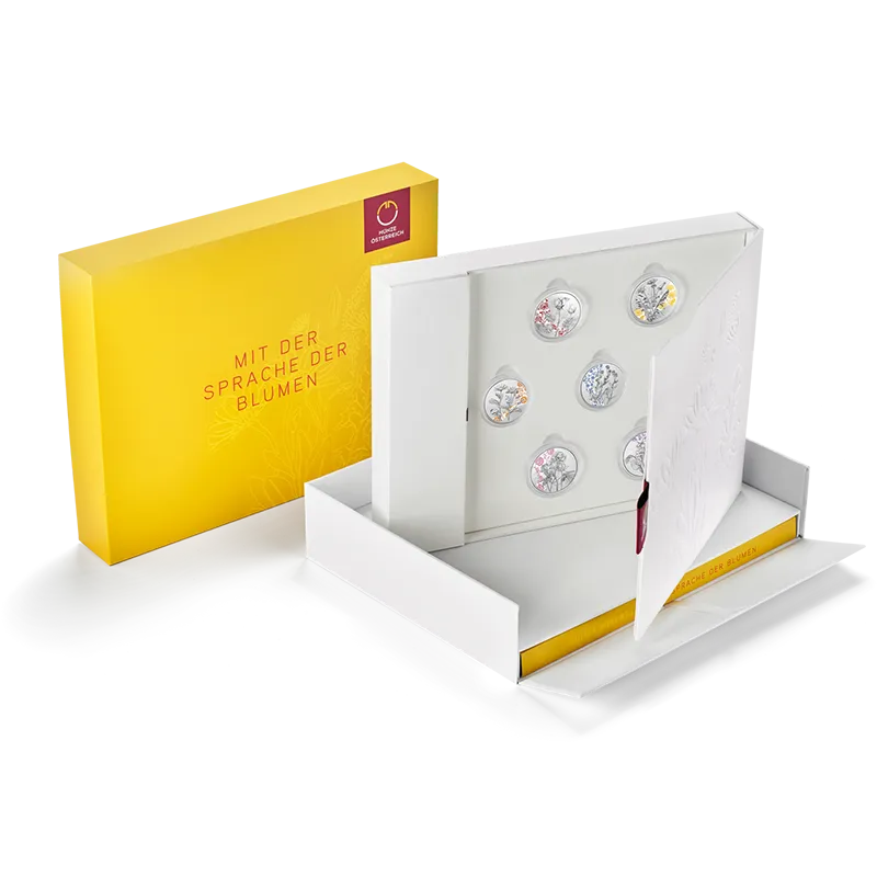 This collector case contains all seven beautiful flowers coins in silver in minting quality proof including the official book of the series "Languages of Flowers" in German language:
