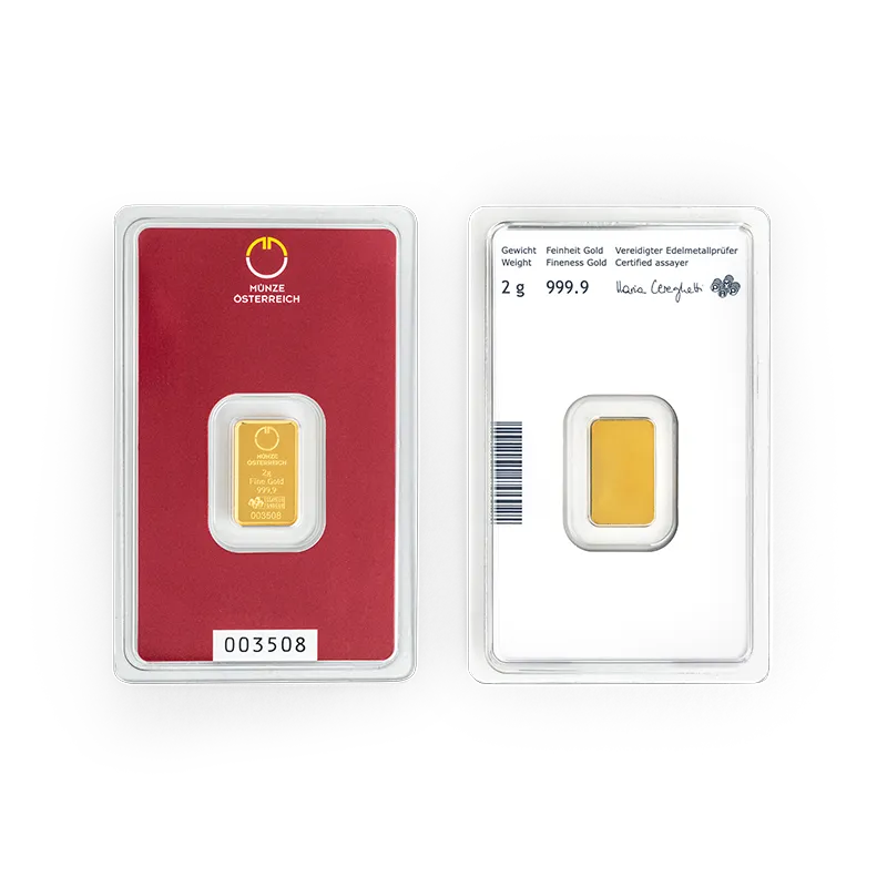 Münze Österreich offers investors a wide selection of gold bars, from 1 g to 1 kg, made from 24 carat gold (fineness 999.9/1000). The markings on the bars provide information about the manufacturer, weight, fineness and serial number.