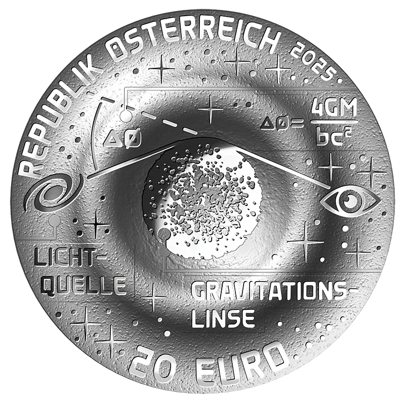 A circular wave curves upwards on the obverse of the coin. Representing an Einstein ring, this is the pictorial multiplication of the light source on the left. Between the light source and the observer, a cluster of galaxies is simplified in the centre, which deflects the light many times due to its gravity. The German for ‘gravitational lens’ refers to its function in this context. The formula Δ∅=4GM/bcÇ, which can be used to calculate the deflection of light, completes the design. The coin’s reverse has the same basic shape as the obverse but features a colour-printed interpretation of an Einstein ring.