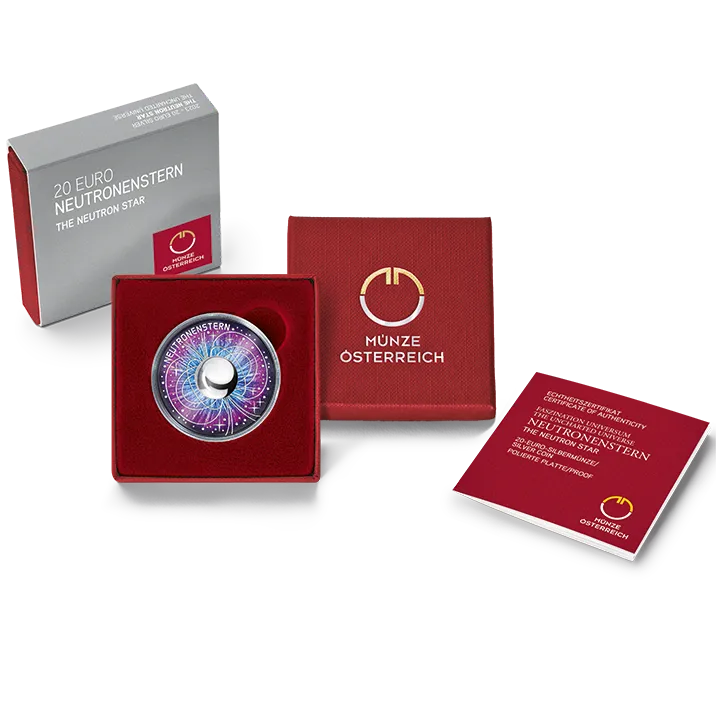 The words ‘crust’ and ‘core’ are marked in German on the coin’s obverse. ‘Crab pulsar’ is the name of a neutron star that was created from a supernova in the year 1054, while ‘1,4 M ’ refers to the neutron star’s solar mass, ‘30rps’ to its rotation speed per second and ‘r~10km’ to its radius. On the coin’s reverse, the neutron star bulges through a coloured imprint and a stylised representation of its magnetic field.