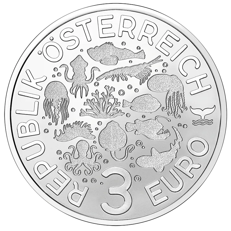 On the reverse of the Devil Scorpionfish, a wide band, reminiscent of an old-fashioned porthole frames an aquatic scene that features a devil scorpionfish in the centre, while a seascape with coral and a shoal of fish can be seen in the background. When ultraviolet light illuminates the scorpionfish, its colors change: from a light, reddish-brown to vibrant red. All 12 of the magical sea creatures in the Luminous Marine Life series are shown in silhouette on the coin’s obverse. Air bubbles up between them and a tail fin disappears beneath the waves to the right.