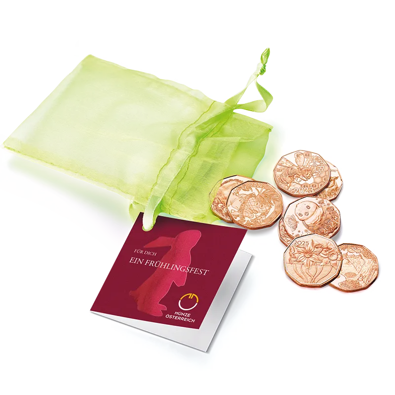 A gift card attached to the bag with a ribbon is decorated with the silhouette of an Easter bunny on the cover and space to write a personal message on the inside. But best of all, the set only costs the same as the face value of all seven coins, which are legal tender in Austria.