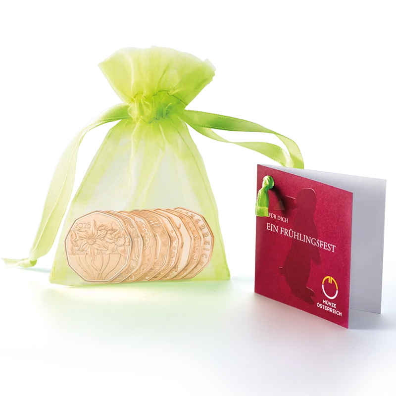 If you are looking for a colourful, lasting Easter gift that is so much more original than giving banknotes, then this charming Easter set is just right for you. A cheerful potpourri of spring scenes is held in a green organza bag in the shape of seven 5 euro copper coins that all convey the same positive message – spring is here!