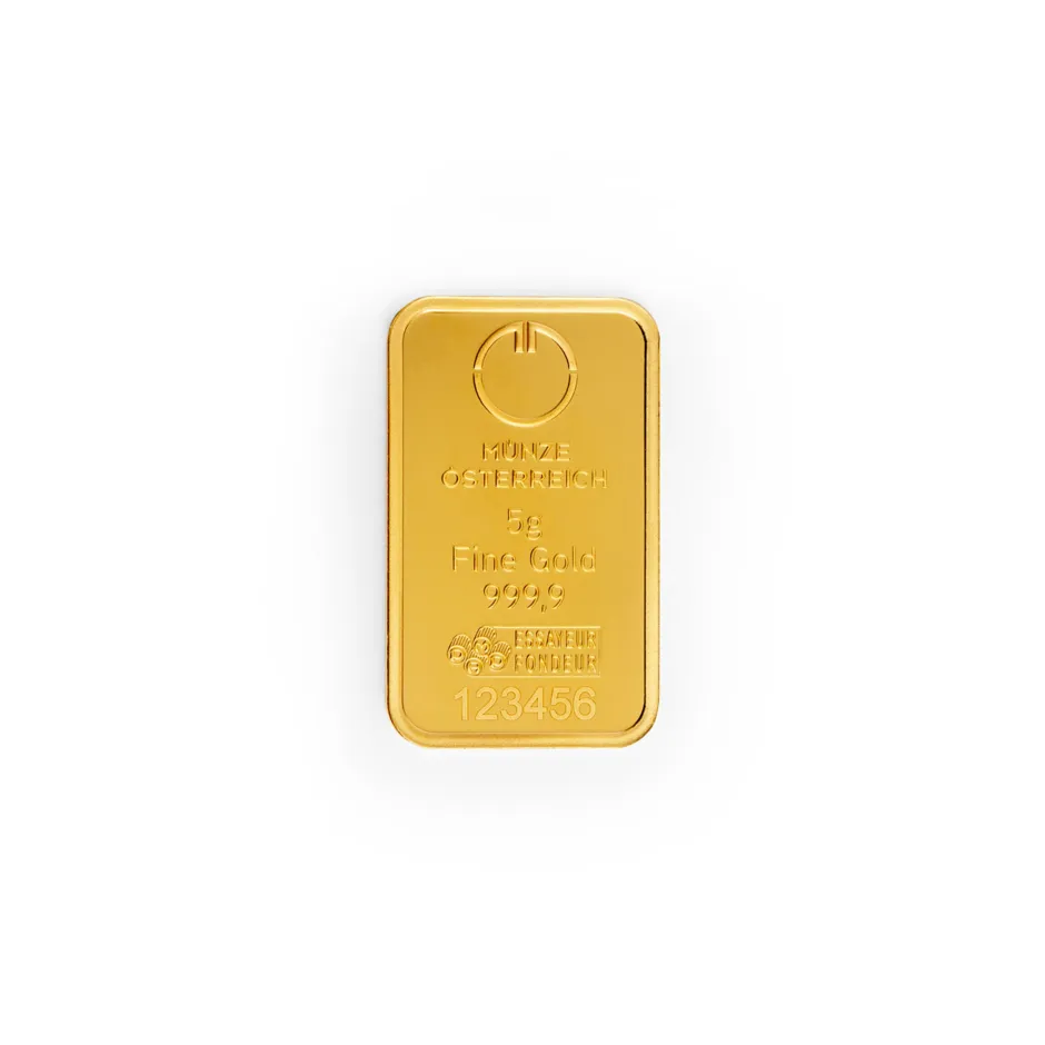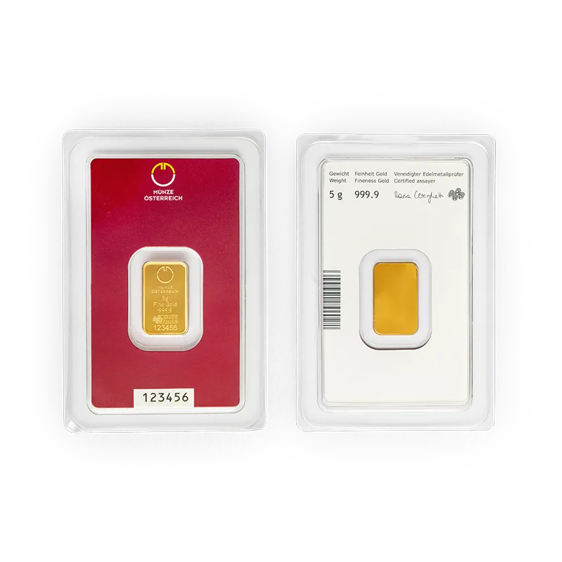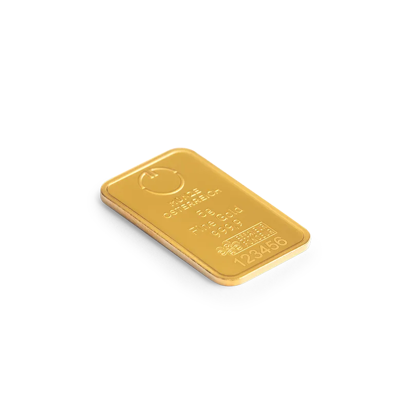 This classically minted 5 g gold bars combine the very highest quality with the trustworthiness of Münze Österreich.