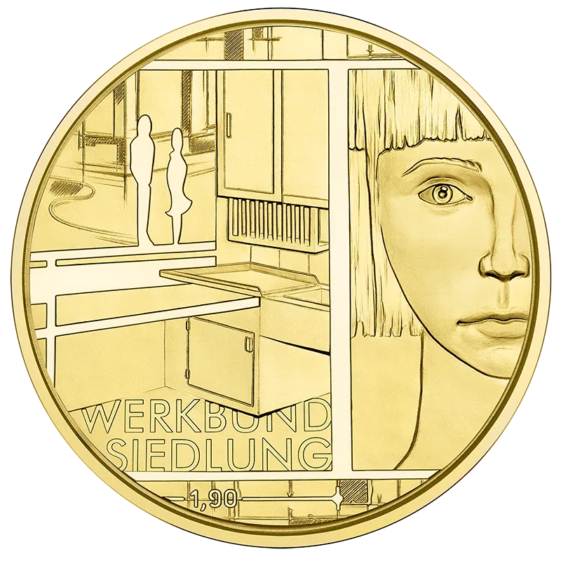 This gold coin captures the essence of Margarete Schütte-Lihotzky's life and work. The obverse features a portrait of the architect in front of a stylised floor plan. In the style of a collage, the coin’s reverse is split between an image of the Frankfurt kitchen, which was just 1.9 metres in width, and a portrait of the aspiring young architect in which Margarete Schütte-Lihotzky confidently exudes the strength that she maintained well until old age. As put by contemporary Viennese architect Christine Zwingl: “Her courage, her joie de vivre, her warmth of heart and her humour influenced many.”