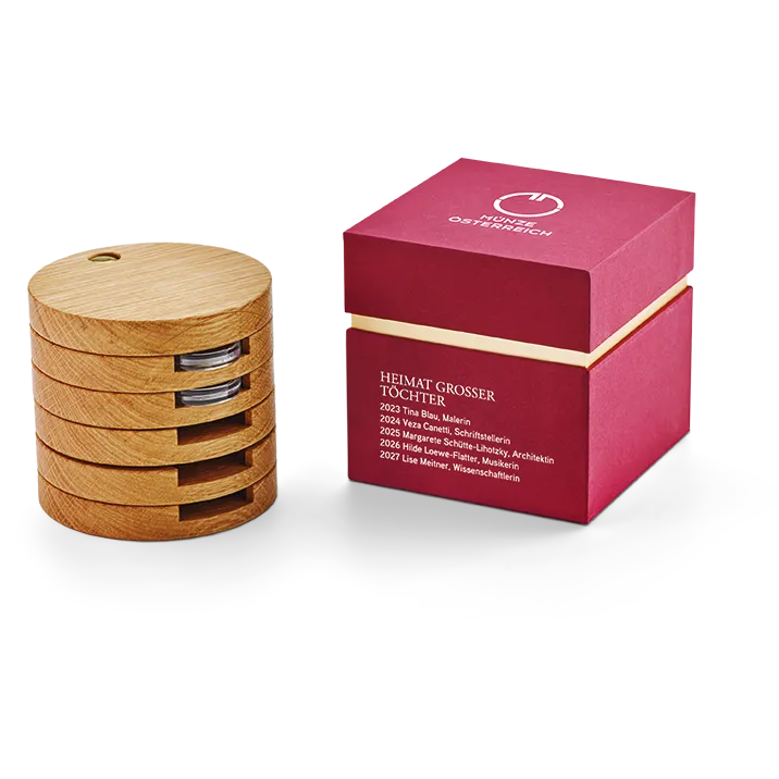 The tower is divided into five separate discs each with a recess that houses and protects one of the five coins in the Austria’s Unsung Heroines series. The discs can be fanned out so that collectors can proudly display all their coins at the same time. Cleverly designed and beautifully finished, this superb collector case perfectly complements this most commendable of coin series.