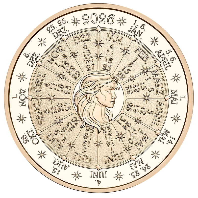From an astrological perspective, Mercury rules the year 2026 and is associated with Gemini and Virgo. The constellation of Gemini can be seen behind Mercury and, at the bottom left edge of the medal, the zodiac signs Virgo and Gemini. On the other side is a depiction of Virgo around whom concentric circles list the dates of all the Sundays and public holidays in 2026.