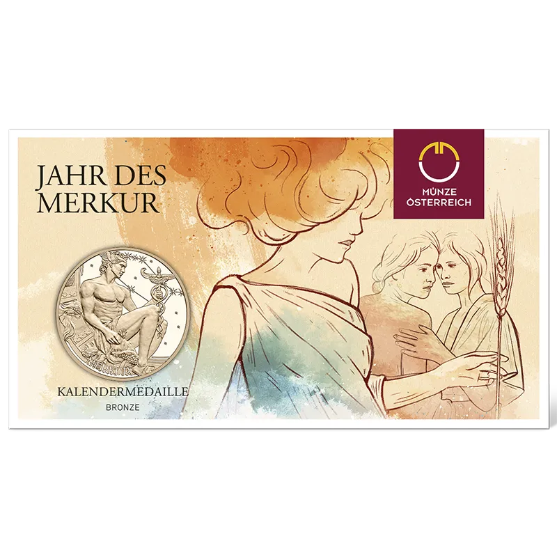 Sporting a winged helmet, the Roman god Mercury is seen lost in thought on the Calendar Medal 2026. In his right hand is a money bag, in his left hand is a caduceus, a winged wand around which two serpents are coiled. The caduceus transformed everything it touched into gold and abundance and was a symbol of peaceful and lawful trade. On its other side, the Calendar Medal 2026 features all the Sundays and public holidays in the year.