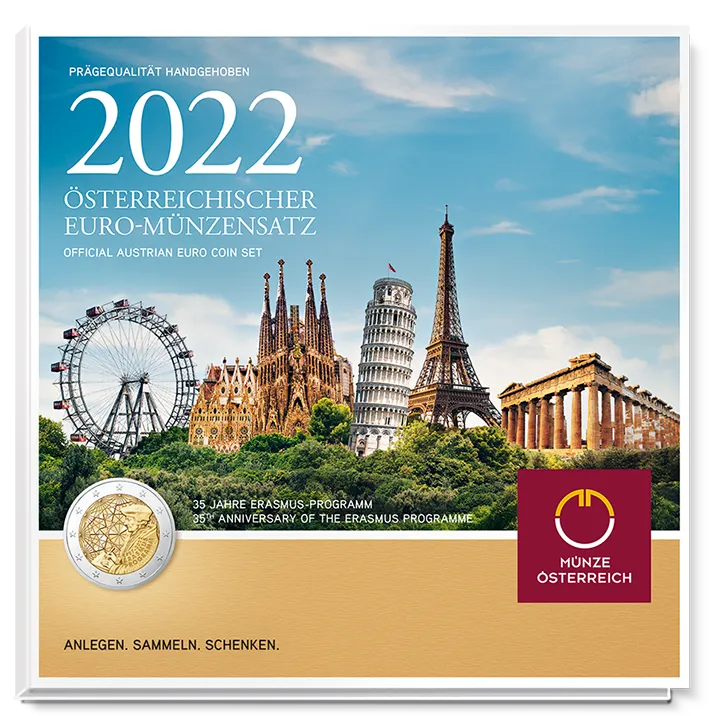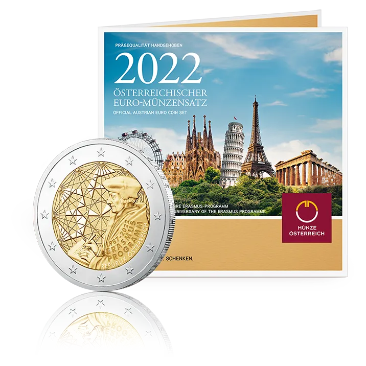 In 2022, the countries of the EU Economic and Monetary Union are celebrating the 35th anniversary of the founding of the Erasmus Programme with the issue of a special 2 euro Erasmus coin. The coin is the crowning glory of this Official Austrian Euro Coin Set 2022, which consists of eight Special Uncirculated quality coins with values from 1 cent to 2 euros.