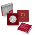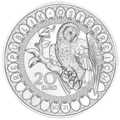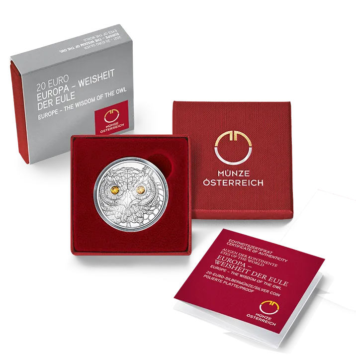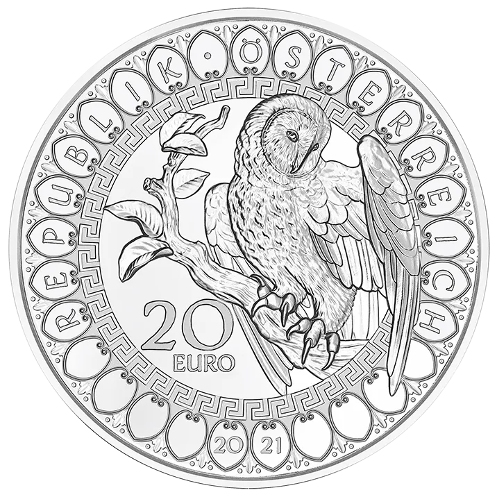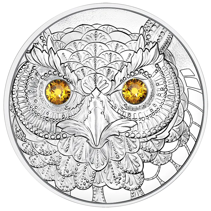 The coin’s reverse is dominated by the stylised face of an owl with eyes of multi-faceted golden-yellow shining crystals by Swarovski®, while the coin’s obverse features an owl sitting on a branch, from which it looks down, patiently and persistently, in search of its prey. The bird is surrounded by decorations reminiscent of ancient Greek ornaments.