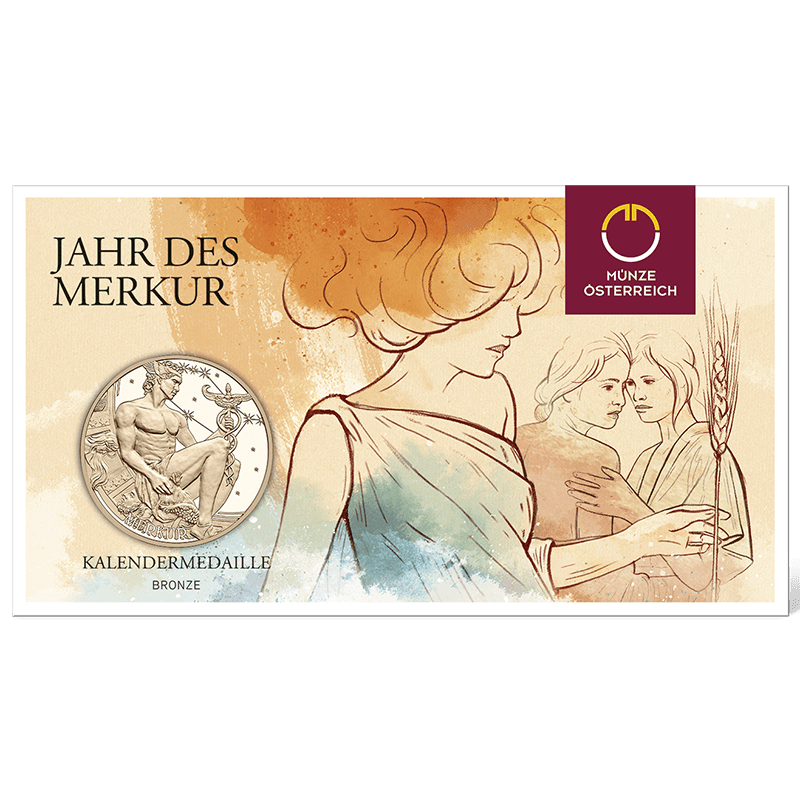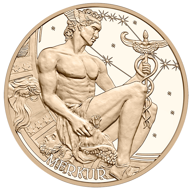 Sporting a winged helmet, the Roman god Mercury is seen lost in thought on the Calendar Medal 2026. In his right hand is a money bag, in his left hand is a caduceus, a winged wand around which two serpents are coiled. The caduceus transformed everything it touched into gold and abundance and was a symbol of peaceful and lawful trade. On its other side, the Calendar Medal 2026 features all the Sundays and public holidays in the year.