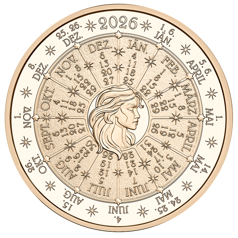 From an astrological perspective, Mercury rules the year 2026 and is associated with Gemini and Virgo. The constellation of Gemini can be seen behind Mercury and, at the bottom left edge of the medal, the zodiac signs Virgo and Gemini. On the other side is a depiction of Virgo around whom concentric circles list the dates of all the Sundays and public holidays in 2026.