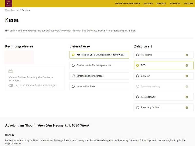 Wählen Sie im Checkout auf der Kassa-Seite die Zahlungsart EPS aus.