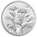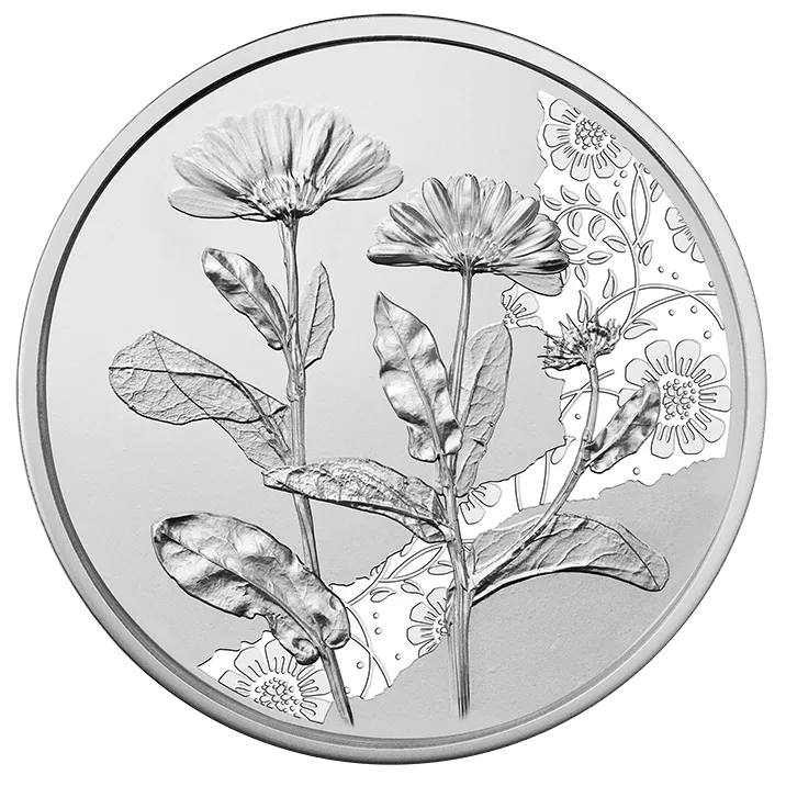 Aan de andere kant hebben echte goudsbloemen hun reliëf achtergelaten, waardoor de bloeiende goudsbloemen op de munt echter lijken dan echt. Achter de planten bevindt zich een band met gestileerde goudsbloemenversieringen. Deze is in kleur op de munten gedrukt in proofkwaliteit.