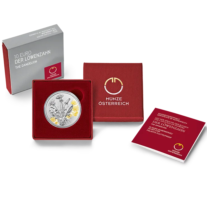 Een wens komt uit. Blaas zijn kleine parapluutjes weg. Of geniet van de aanblik op de munt. Geniet van de gedetailleerde afdruk van een levende paardenbloem in volle bloei. Het lijkt echter dan echt. Je hartenwens wordt werkelijkheid. Met behulp van de paardenbloemmunt.