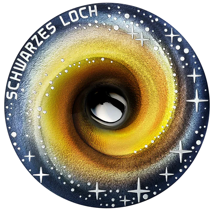 "Black Hole" is de tweede munt in de driedelige serie "Fascination Universe" Elk van de munten heeft een andere ongebruikelijke vorm. De universe munten zijn gemaakt van Ag 925 zilver en bedrukt in kleur.