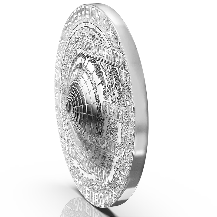 Kom dicht bij de Heilige Graal van de theoretische fysica en neem een kijkje in een zwart gat. Deze unieke munt - in de vorm van een kegel en een trechter - werpt licht op een mysterieus fenomeen. - De serie heet niet voor niets "Fascination Universe", je zult versteld staan.