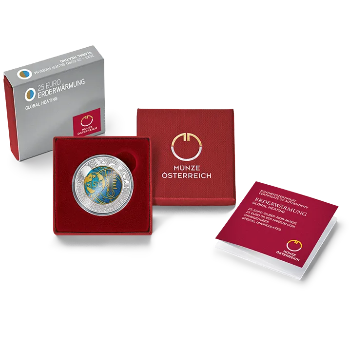 De klimaatbeschermingsmunt "Global warming", gemaakt van zilver en niobium met een nominale waarde van 25 euro: een betekenisvol geschenk en een actueel thema.