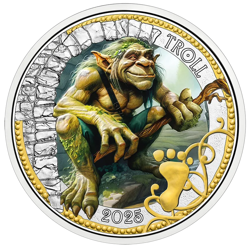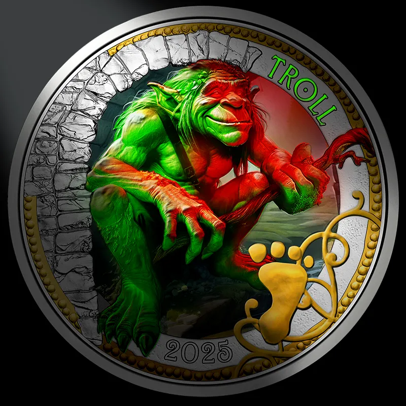 De munt "Troll" wordt uitgebracht op 5 november 2025. Op de voorzijde verschijnt de trol in kleur en is zo rijk gedetailleerd dat hij bijna uit de munt lijkt te stappen. Een mysterieuze stenen brug, gouden ornamenten en een voetafdruk met vier tenen versterken de sprookjesachtige indruk. Maar onder UV-licht gebeurt het echte wonder: de kleuren beginnen fel te gloeien, de letters TROLL schitteren - de trol komt tot leven.