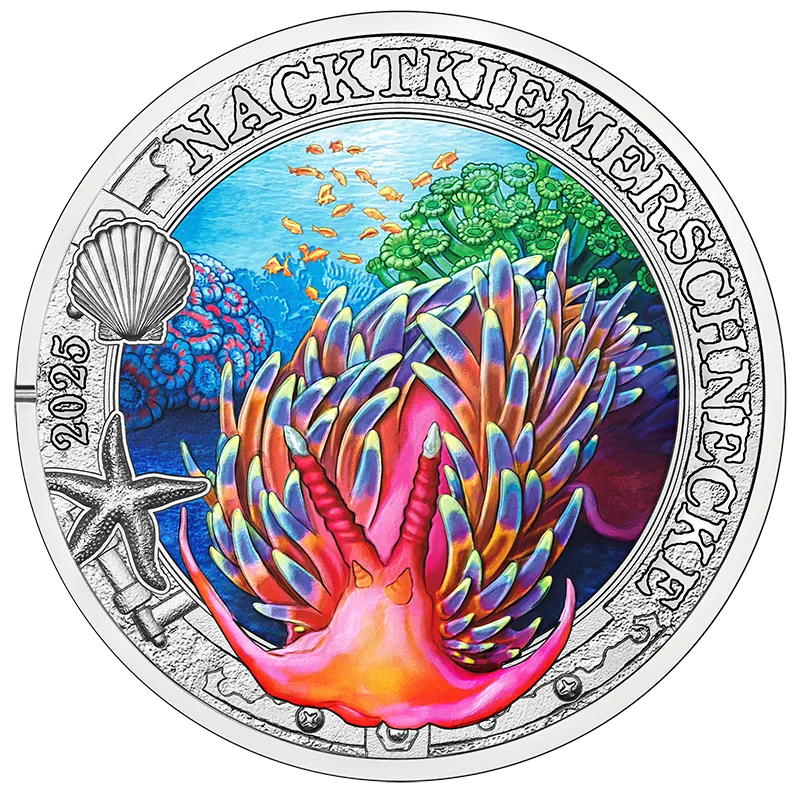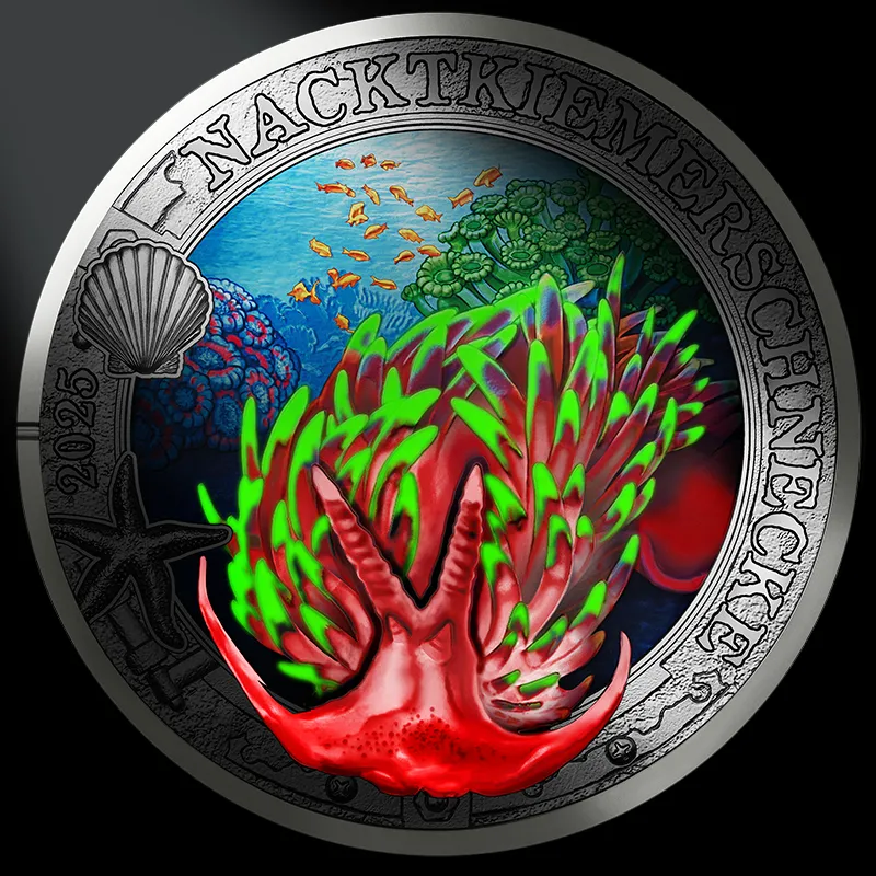 Op de elfde munt van 3 euro in de serie "Luminous Marine Worlds" staat een naaktslak waarvan de excentrieke vorm bewonderenswaardig is en waarvan de kleuren veranderen onder UV-licht.