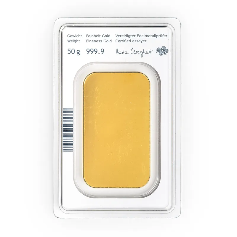 Elke goudbaar draagt het Melter & Assayer-merk van de betreffende producenten. Dit staat garant voor gecontroleerde echtheid, een hoge afwerkingskwaliteit en internationale verhandelbaarheid. Dankzij de samenwerking met twee toonaangevende producenten profiteren beleggers van een optimale leveringszekerheid en een consistent kwaliteitsniveau.