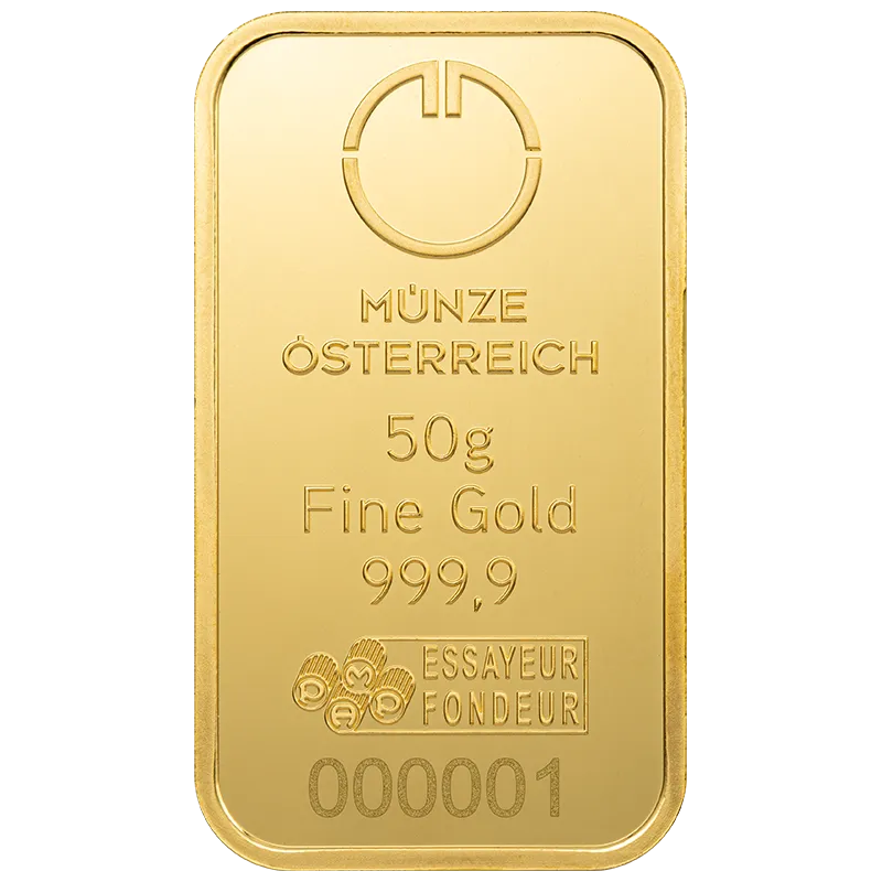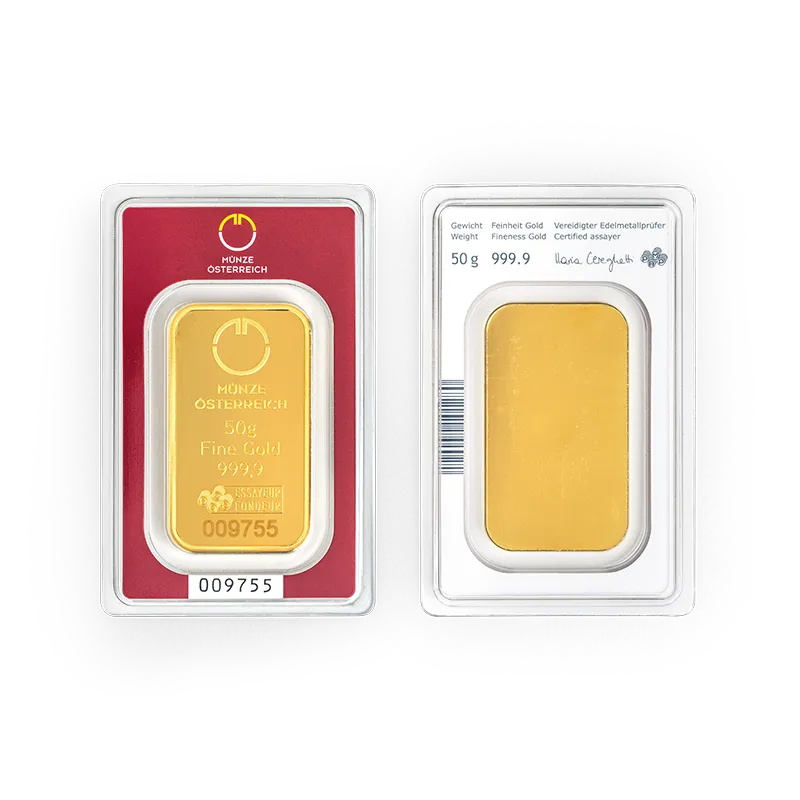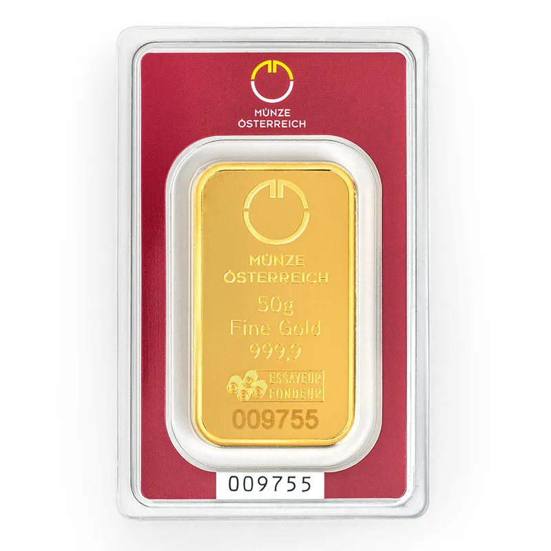 Münze Österreich AG biedt beleggers een brede selectie goudbaren van 1 gram tot 1 kilogram aan - gemaakt van 24 karaat goud (fijnheid 999,9/1000). De baren dragen een duidelijke markering met vermelding van de fabrikant, het gewicht, de fijnheid en het serienummer.