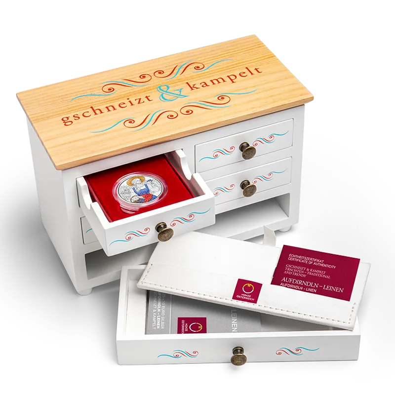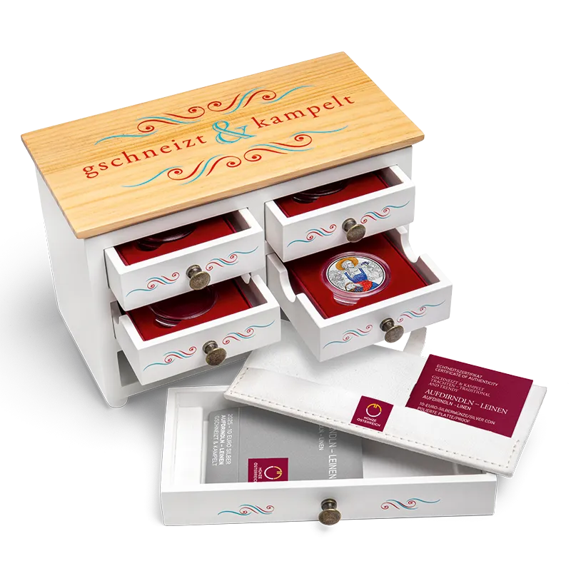 Passend bij de nieuwe muntserie "gschneizt & kampelt" bieden wij u een exclusief verzamelsysteem: een elegante houten cassette die is ontworpen in de stijl van een boerenladenkast. Het combineert traditie en vakmanschap op een elegante manier en weerspiegelt het thema van de muntserie: traditionele klederdracht.