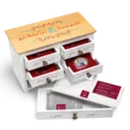 De verzameldoos heeft vijf laden. De munten en hun rode hoesje zijn opgeborgen in de bovenste vier laden - beschermd in de hoes of open voor presentatie. De onderste lade biedt extra opbergruimte voor de certificaten en eventueel voor de slipcase.