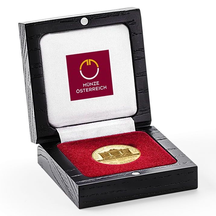 Goed opgeborgen voor de toekomst: de bijpassende kist voor je gouden 1/2 ounce gouden Vienna Philharmonic munt. Perfect om je schat in te bewaren of als cadeau.