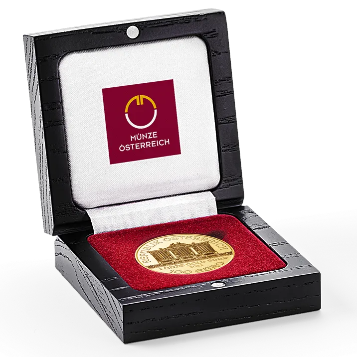 Goed beschermd voor de toekomst: de bijpassende kist voor uw 1 ounce Wiener Philharmoniker munten in goud, zilver of platina. Ook geschikt voor de 100 kroon munten. Perfect om je schat in te bewaren of als cadeau.