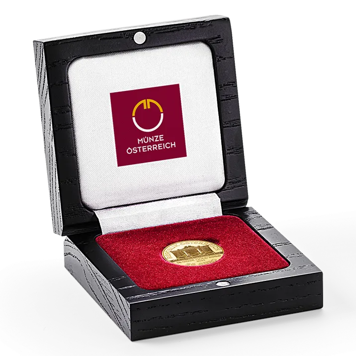 Goed opgeborgen voor de toekomst: het bijpassende doosje voor je gouden gouden gouden Weense Philharmoniker munten van 1/4 ounce. 8 gulden en 20 kronen passen ook in dit doosje. Perfect om je schat in te bewaren of als cadeau.