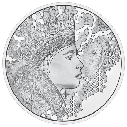 Die andere Seite der limitierten Silbermünze zeigt eine junge Frau im Profil: eine Allegorie des Winters, eine Schneeprinzessin. Sie trägt eine Krone und einen Mantel, die beide mit Schneekristallen verziert sind. Der Hintergrund ist im Bereich der Krone zum Teil poliert, ebenso im rechten unteren Bereich, in dem sich Schneekristalle herausbilden.