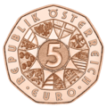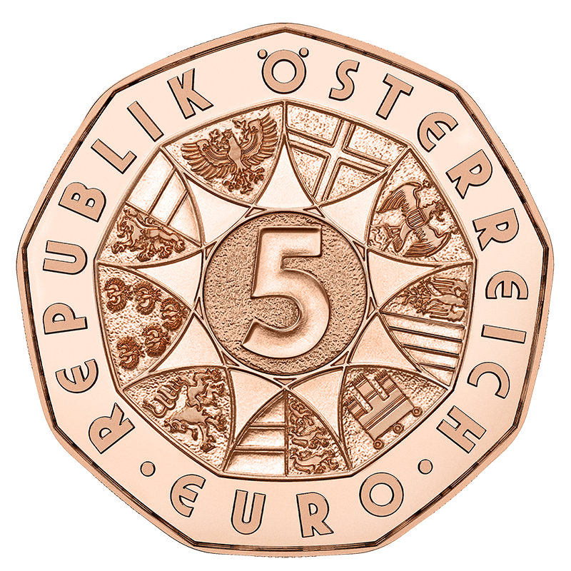 Auf der Münze hüpft ein Kind mit großem Vergnügen in eine Lacke, sodass es nur so spritzt! Wunderbarerweise besteht die Fontäne nicht nur aus Wasser, sondern auch aus Kleeblättern, Herzen und Münzen. Wie bei den vorhergegangenen österreichischen 5-Euro-Münzen sind auf der Wertseite der neuneckigen Münze die neun Landeswappen im Kreis angeordnet.