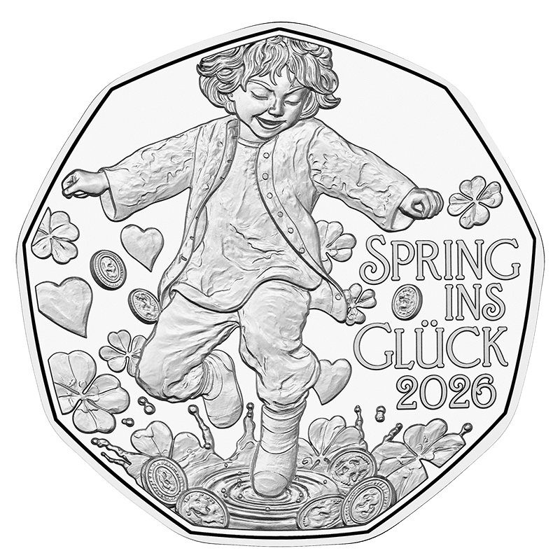 Auf der Münze hüpft ein Kind mit Genuss in eine Lacke. Es erlernt und probt spielerisch, worauf es sich im besten Fall später als Erwachsener verstehen wird: Mit Freude ans Werk gehen, raus aus der Komfortzone, rein ins Abenteuer! Unsere hochwertig geprägte, neuneckige 5-Euro-Neujahrsmünze aus Silber ist in ihrer fröhlich gestalteten Geschenkverpackung ein kleines Kunstwerk mit großer Botschaft: Wer mit Zuversicht und Schwung ins neue Jahr springt, darf sich auf schöne Überraschungen freuen. Ein Sprung ins Glück braucht oft nicht viel – nur ein wenig Mut. Das Beste ist vielleicht nur einen Sprung weit entfernt. Wagen Sie’s!