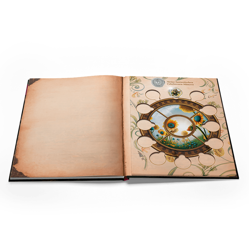 Genau wie Violetta und Iggy, die Helden der Erzählung, finden auch Sammlerinnen und Sammler den Schlüssel in diese Welt: das exklusive Sammelalbum zu Fantastische Fabelwesen. Es ist nicht nur ein sicheres Zuhause für alle zwölf 3-Euro-Münzen, sondern auch ein Buch, das die Münzen in eine lebendige Geschichte einbettet. Jede Münze hat ihren eigenen Platz: Vertiefungen im Inneren des Albums halten sie passgenau fest. Eine transparente Schutzfolie legt sich wie eine zweite Haut darüber, bewahrt die Münzen vor Kratzern und macht das Blättern zu einem Erlebnis, bei dem sich Kunst und Sicherheit verbinden.