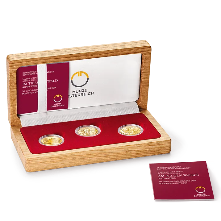 Die Sammelkassette zur dreiteiligen Goldmünzen-Serie „Naturschatz Alpen“.