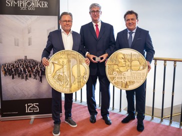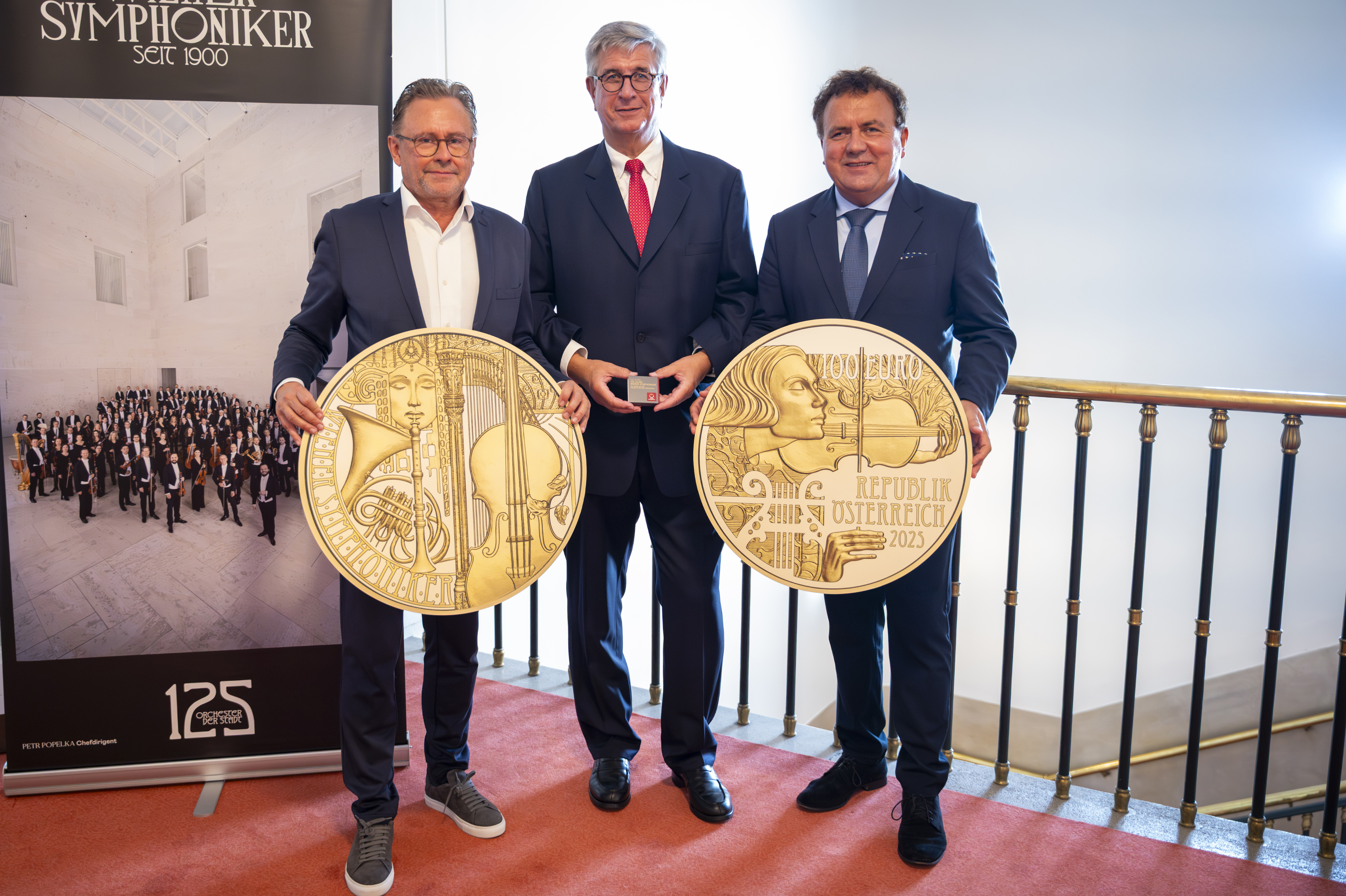 Wien – Unmittelbar vor dem Konzert von Franz Schmidts Das Buch mit sieben Siegeln unter Fabio Luisi im Wiener Konzerthaus, wurde heute die neue 100-Euro-Goldmünze 125 Jahre Wiener Symphoniker offiziell vorgestellt. Die Münze Österreich würdigt mit der Ausgabe das 125-jährige Bestehen des Orchesters.